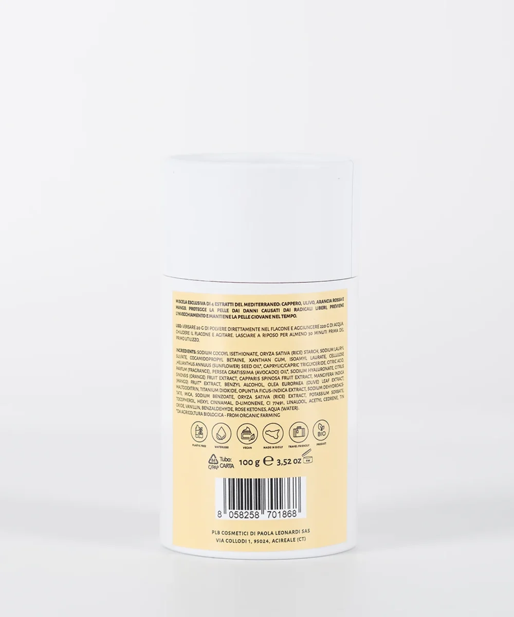 Il Bagnocrema in polvere solubile rappresenta un’evoluzione nel mondo della detersione consapevole. Si tratta di una miscela esclusiva che racchiude la forza di 5 estratti del Mediterraneo: Cappero, Ulivo, Ficodindia, Arancia Rossa e Mango. Questi ingredienti, naturalmente ricchi di polifenoli, lavorano in sinergia per proteggere la pelle dai radicali liberi e contrastare l’invecchiamento cutaneo. Pensato per viso e corpo, è particolarmente indicato per le pelli secche, regalando morbidezza e un immediato senso di comfort.