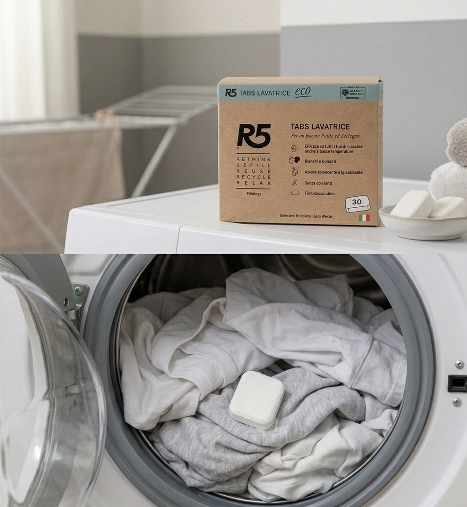 Ogni tab è racchiusa in un film idrosolubile in PVOH, scelto per garantire l’integrità del prodotto ed evitare gli sprechi legati alla polverizzazione o al deterioramento precoce, tipici delle formulazioni prive di involucro.