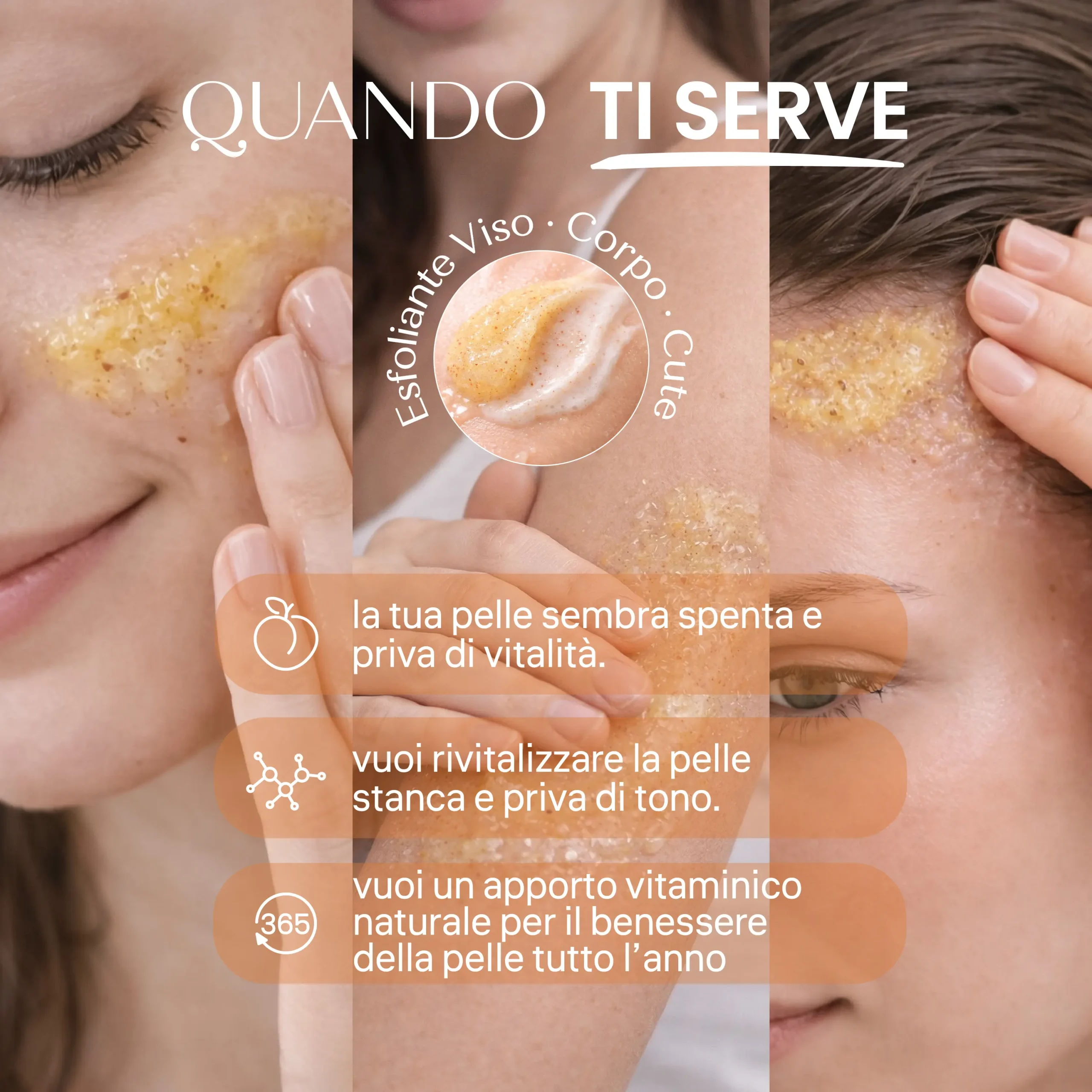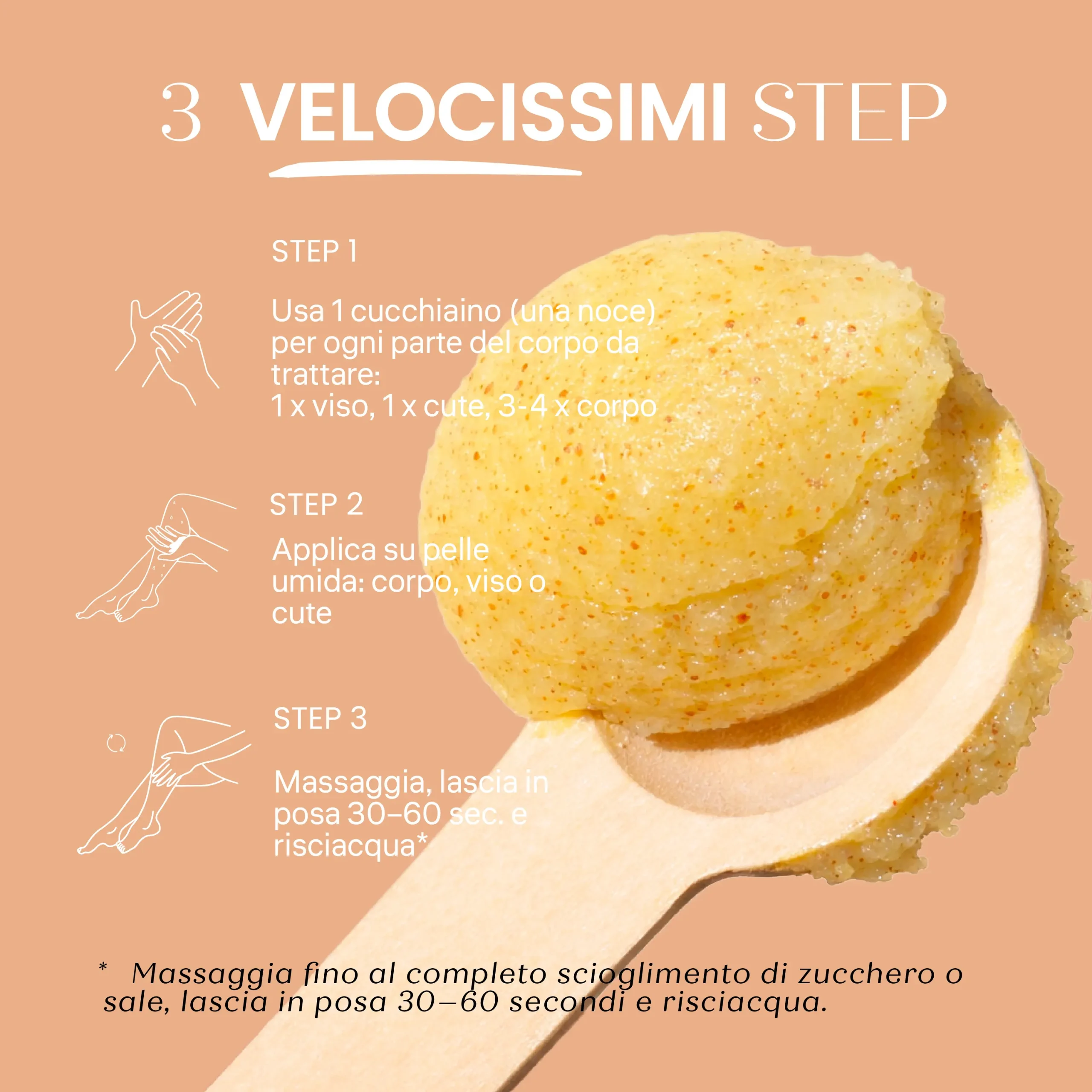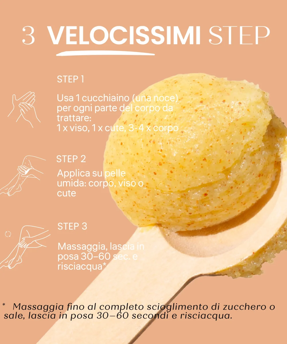 Zucchero di Barbabietola e Perle di Jojoba: Lavorano in sequenza per un’esfoliazione modulata; lo zucchero idrata mentre si scioglie, le perle levigano la grana della pelle con estrema dolcezza.