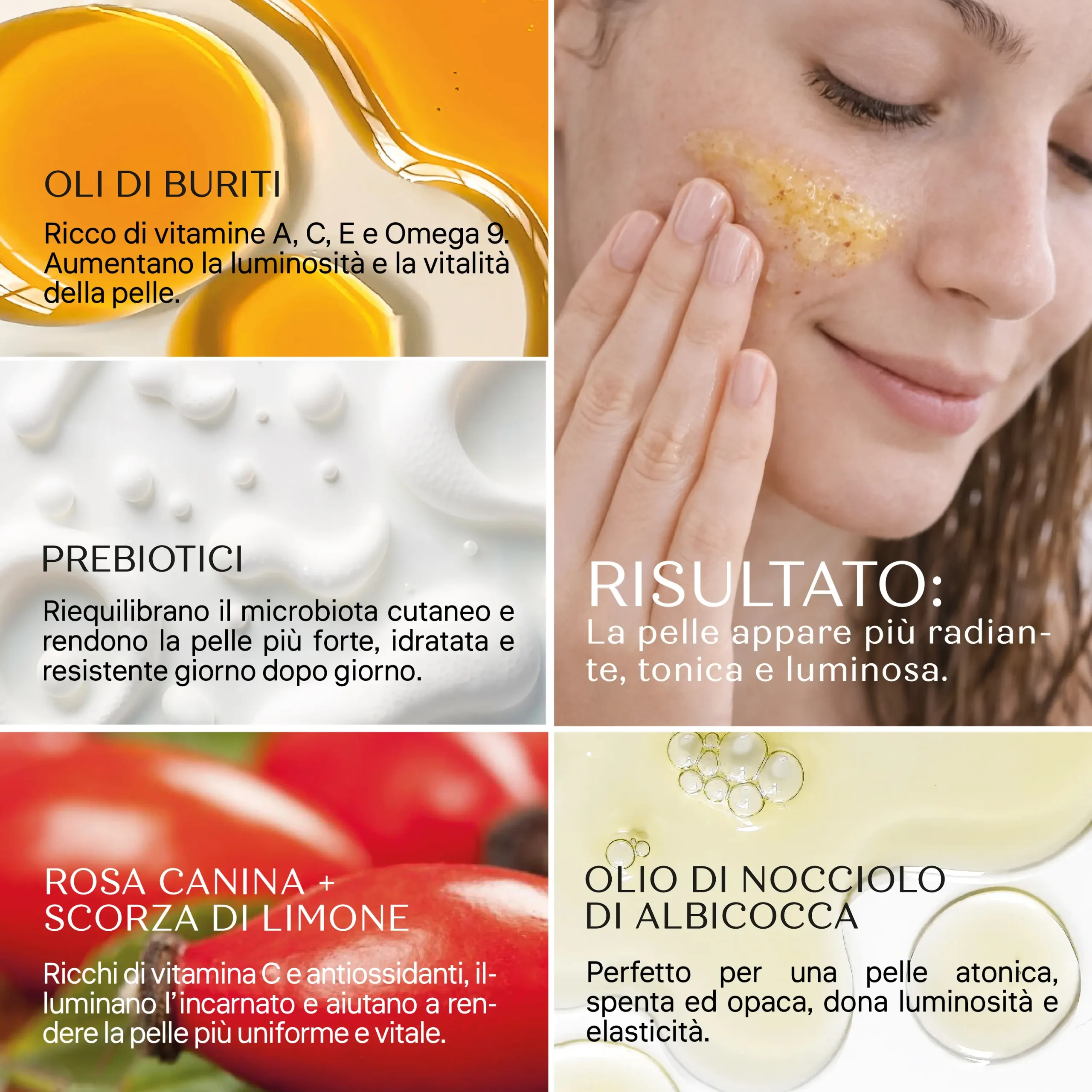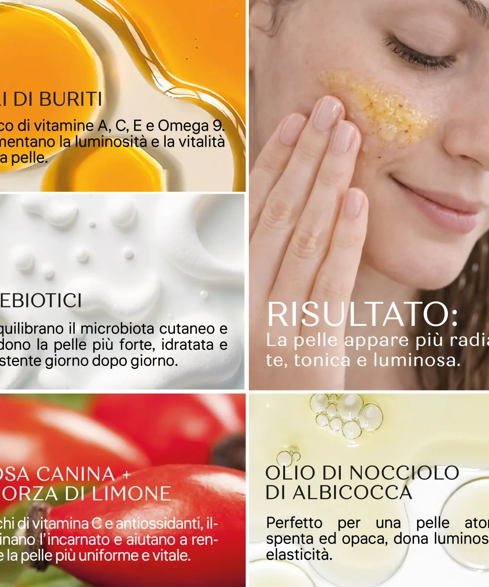 La forza di questo gommage risiede nella sua sinergia di super-food cutanei: