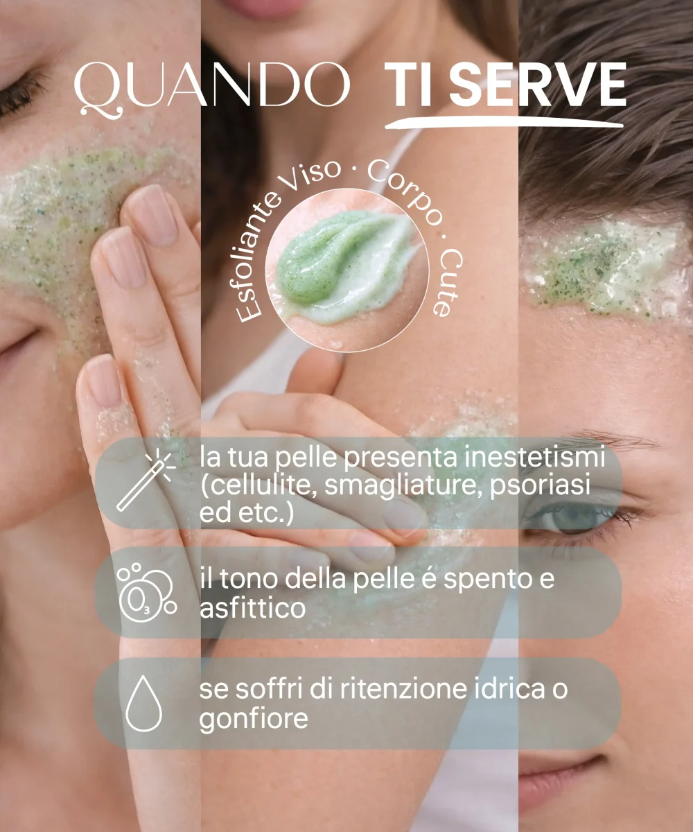 È l’alleato ideale per trattare pelli che presentano inestetismi come cellulite, ristagni o imperfezioni (incluse dermatiti o psoriasi). Grazie alla sua azione equilibrante, è perfetto anche per il viso, specialmente se l’incarnato appare spento e necessita di ritrovare ossigenazione e vitalità. È adatto a ogni tipo di pelle che desideri una sensazione di rinnovo e leggerezza.