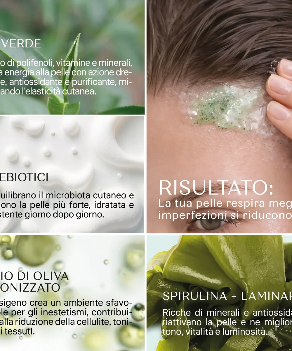 Tè Verde e Prebiotici: Un mix antiossidante e protettivo che calma la pelle e sostiene l’equilibrio del microbiota cutaneo, rafforzandone le barriere naturali.