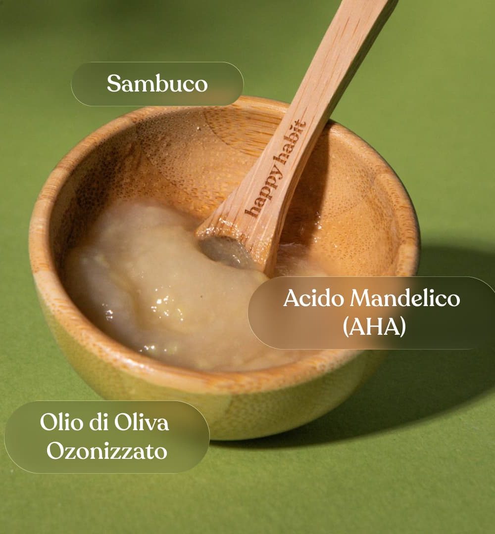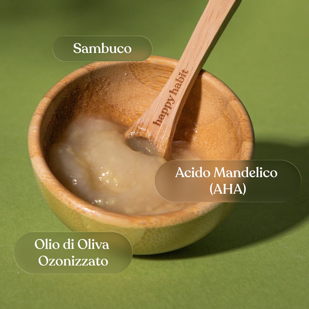 Azione Riequilibrante: L’acido mandelico esfolia dolcemente favorendo il turnover cellulare, mentre il sambuco e l’olio d’oliva leniscono eventuali rossori.