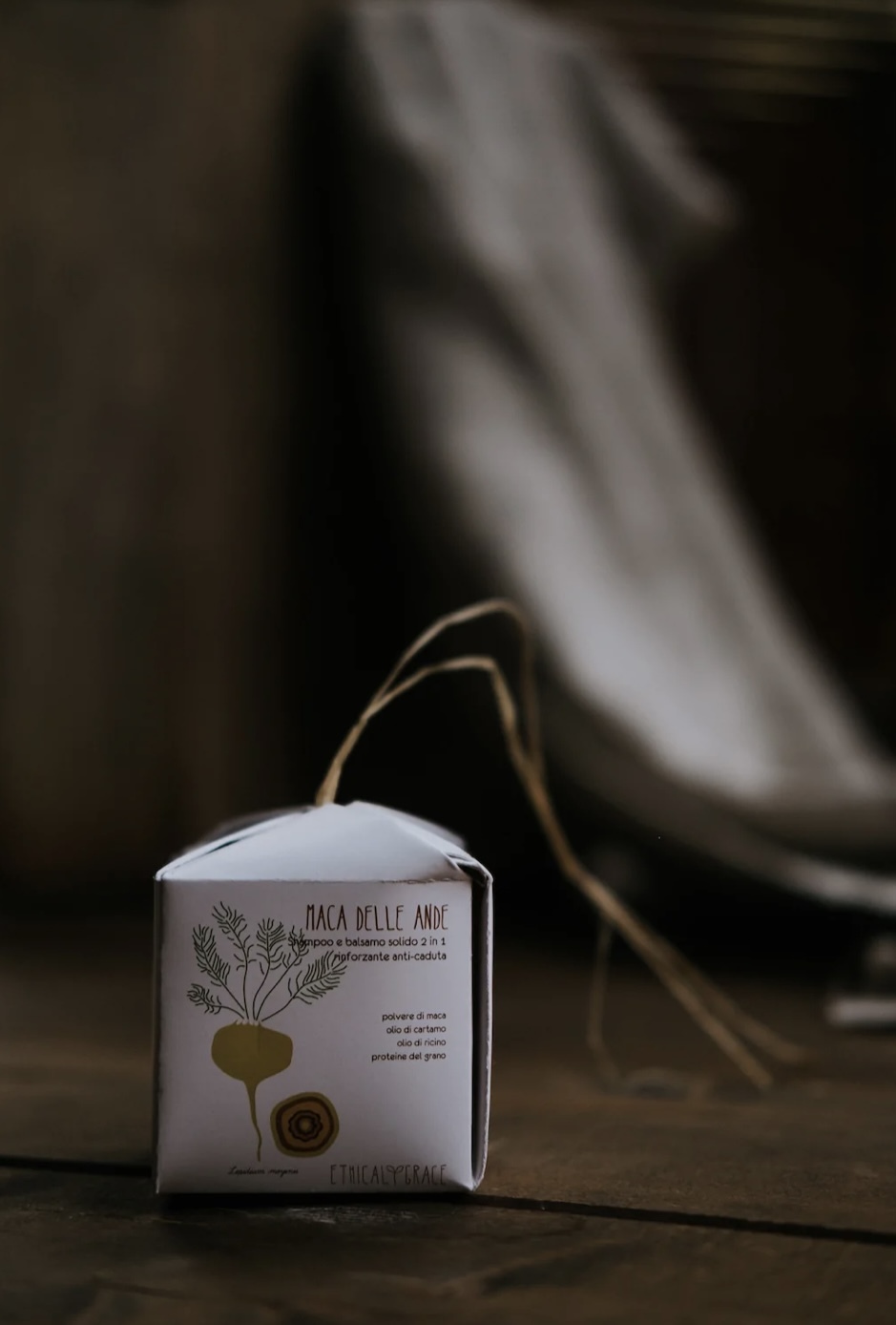 Inci: Sodium coco sulfate, Sodium cocoyl isethionate, Cocamydropropyl betaine (tensioattivi di orgine naturale), Ricinus communis seed oil (olio di ricino), Carthamus tinctorius seed oil (olio di cartamo), Stearic acid, Cetearyl Alcohol (emulsionanti di origine naturale), Lepidium meyenii root extract (polvere di maca), Behentrimonium Chloride (condizionante di origine naturale), Zingiber officinalis root oil (olio essenziale di zenzero), Citrus paradisi peel oil (olio essenziale di pompelmo), Hydrolized wheat proteins (proteine da grano), Citrus aurantium peel oil (olio essenziale di petitgrain), Rosmarinus officinalis leaf oil (olio essenziale di rosmarino), Limonene*, Citral*, Geraniol*, Linalool*